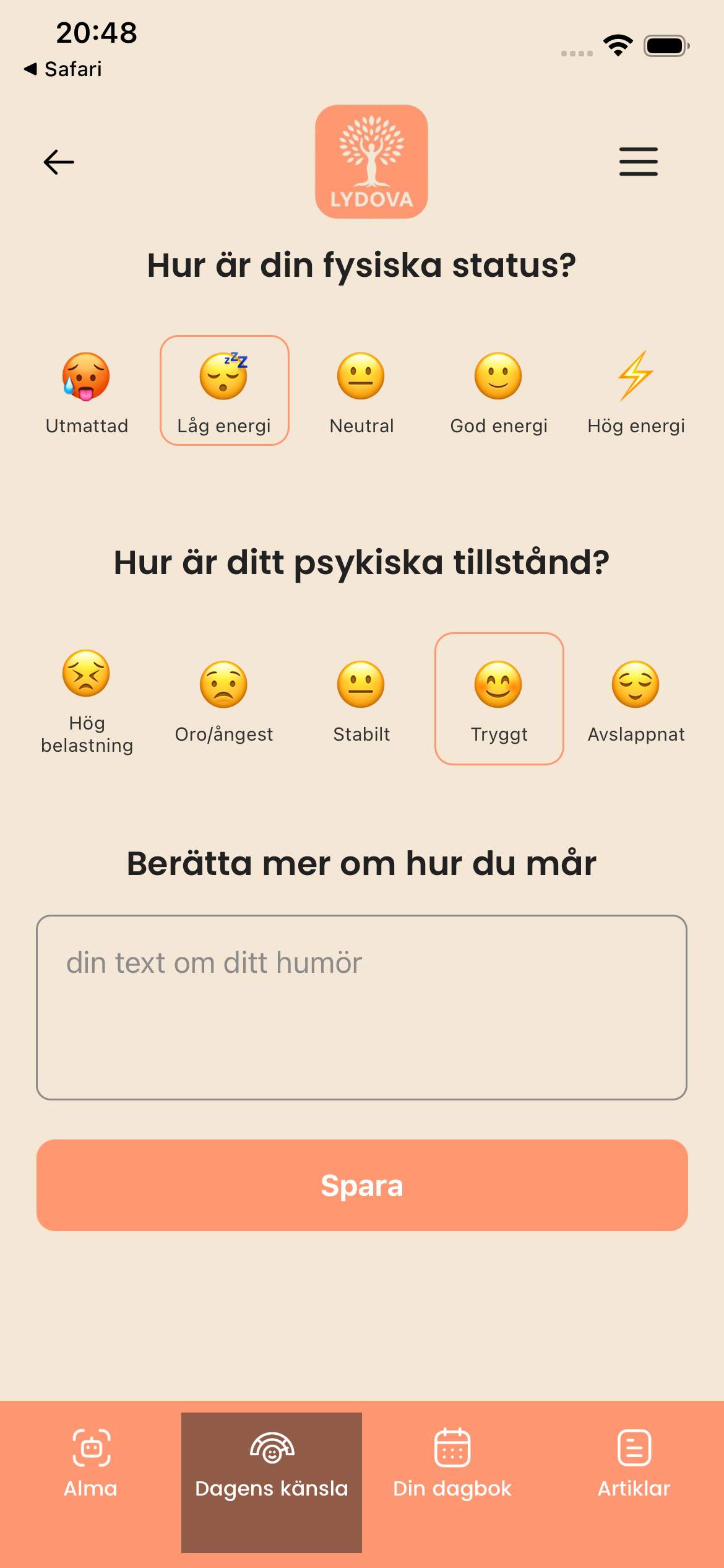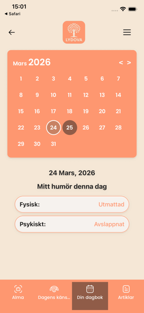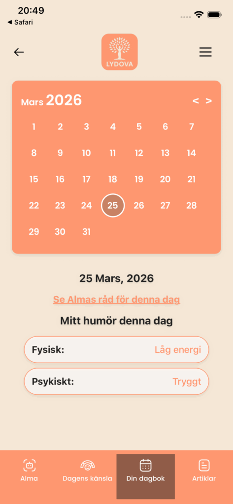 Lydova låter dig forma din upplevelse i din egen takt – oavsett om du vill checka in med ditt humör, följa din cykel eller bara ta ett lugnt ögonblick med Alma.